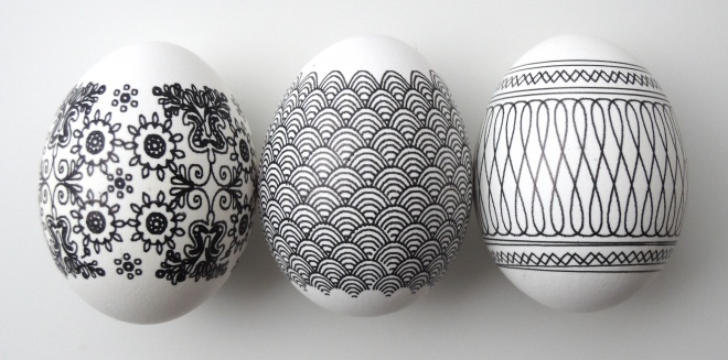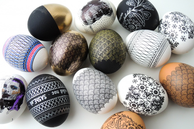 S čím sa dá ešte experimentovať, sú farby, či už fixiek / popisovačov, alebo aj samotného vajíčka. Veľmi pekne ukáže metalický popisovač na tabuľovo čiernom vajci.