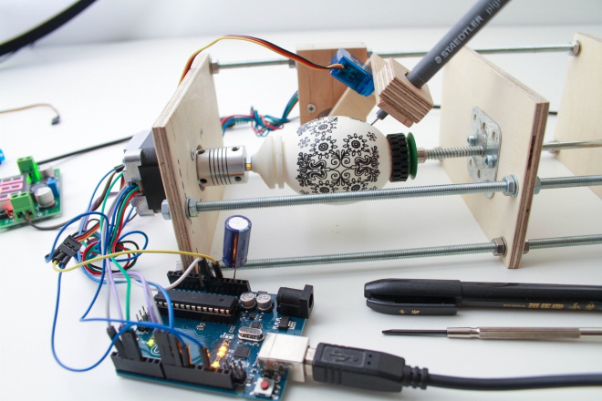 G kód sa následne pošle cez USB do Arduina, ktoré si tento G kód preloží priamo na povely motorom a servu. Jeden motor otáča celým vajíčkom, druhý motor otáča rameno s fixkou a tretí motor - servo - zdvíha fixku, keď ju potrebujeme premiestniť na iné miesto bez toho, aby kreslila. Rameno s fixkou vlastnou váhou tlačí na vajíčko a kopíruje tak jeho nedokonalý tvar.